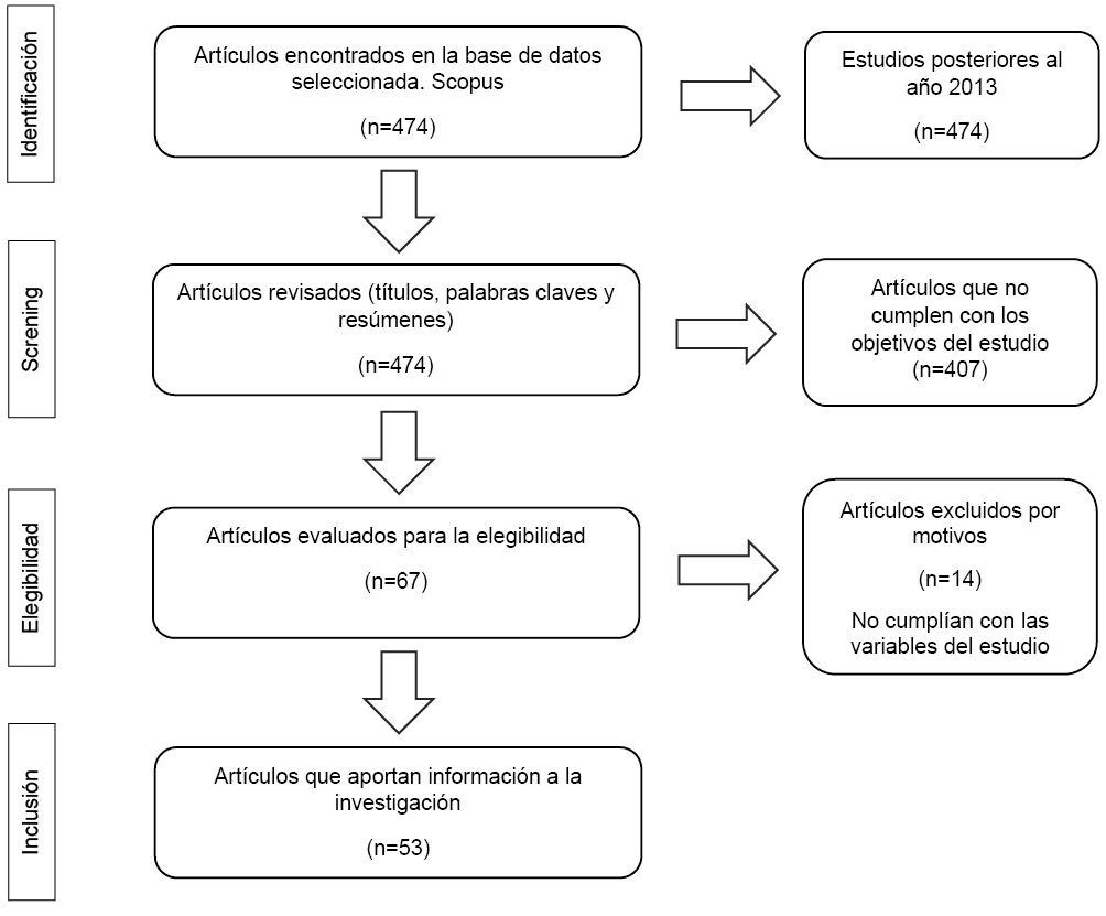 Tras la búsqueda total en la base de datos, se obtuvo un total de 474 artículos (Figura 1), los cuales se indexaron en el diagrama de flujo prisma. Luego, se aplicaron los criterios estipulados allí y se lograron seleccionar 53 artículos de la categoría inclusión que aportan información a la investigación.
