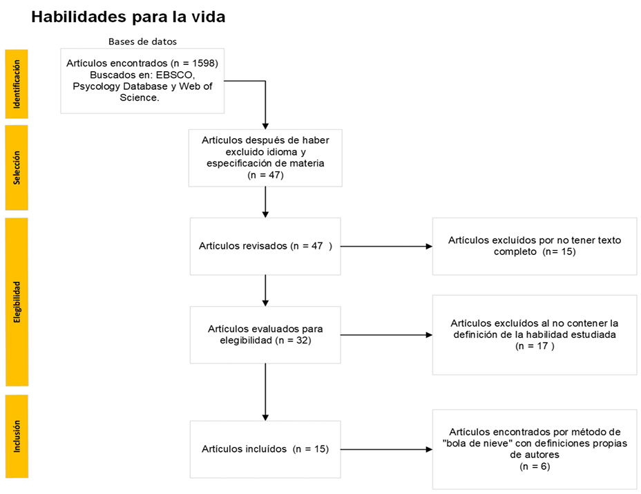 En habilidades para la vida se encontraron, por medio de 3 bases de datos mencionadas anteriormente, 1598 artículos con la búsqueda de (TI “life skills” AND SU “life skills” AND AB “life skills”). No obstante, al filtrar por idioma únicamente documentos en inglés y español, así como por materia “life skills” o “mental health”, se obtuvo un total de 47 publicaciones, de las cuales se excluyeron 15 teniendo en cuenta la imposibilidad de acceso al texto completo, para un total de 32 documentos. Finalmente, según el criterio de contener definición de la habilidad estudiada, se logró obtener un total de 15 artículos incluidos, en donde se especificaba la definición citada de otros autores. En este punto se aplicó el método de bola de nieve, con lo cual se encontraron 6 artículos con definición propia de su autor para el término habilidades para la vida (figura 1) las cuales se incluyeron en el estudio.