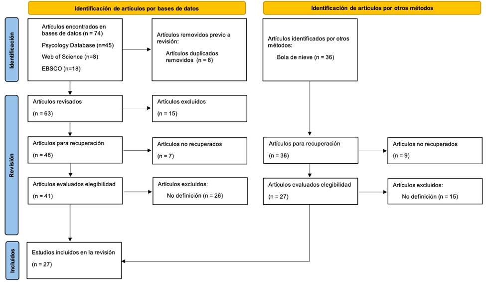 De manera paralela, se realizó una búsqueda bibliográfica por el método de bola de nieve, con el fin de encontrar nuevos artículos y rastrear aquellos que propusieron las definiciones originales; así pues, se identificaron 36 nuevos artículos, de los cuales no fue posible recuperar el texto completo de 9. Posterior a la revisión detallada de los artículos encontrados, se seleccionaron 12 que plantean una definición (original o citada) y fueron incluidas en el estudio. Con ello, la presente revisión incluyó un total de 27 artículos para el concepto de habilidades blandas.