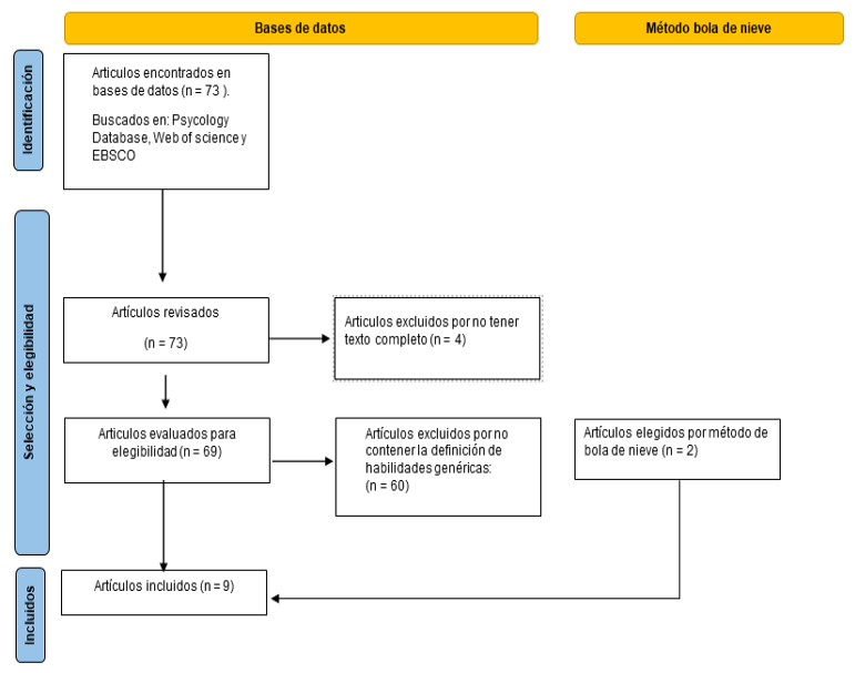 Por último, en cuanto a las habilidades genéricas se examinaron las 3 bases de datos mencionadas, aplicando filtros de búsqueda con el término “generic skills”, excluyendo artículos que no estuvieran en el idioma inglés o español y que no contaran con la definición de habilidades genéricas. Se encontraron un total de 73 artículos de los cuales se excluyeron 4 dada la no disponibilidad del texto completo; a su vez, se excluyeron 60 artículos por no resultar útiles para la presente revisión. Finalmente, se obtuvieron 9 artículos que contaban con una definición (original o citada) que fue incluida en el estudio. Para la búsqueda de las definiciones originales, se utilizó el método de bola de nieve mediante el cual se obtuvieron 2 artículos adicionales que cuentan con la definición del concepto requerido. Con ello, la presente revisión incluyó un total de 11 artículos para el concepto de habilidades genéricas.