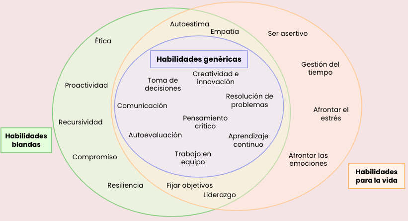 El ser humano es un ser dinámico y cambiante, que se ve enfrentado a múltiples situaciones a lo largo de su vida que le exigen herramientas clave para afrontarlas y superarlas de forma exitosa; dentro de estas se resaltan las habilidades que van adquiriendo para este fin como lo son las habilidades para la vida, habilidades blandas y habilidades genéricas. Respecto a las habilidades para la vida y habilidades blandas, estas dos comparten algunas de sus características, sin embargo, fue posible identificar una diferencia muy específica entre las habilidades blandas y las habilidades para la vida. Se describe que las habilidades blandas tienen un enfoque de uso más dirigido hacia el mundo y la vida laboral comparado con las habilidades para la vida, que parecen ser más útiles para la adaptación a la vida adulta en general, haciendo a los profesionales un poco más integrales respecto a solamente sus habilidades técnicas. Otro punto es que las habilidades genéricas se podrían identificar como aquellas habilidades que se encuentran entre ambas habilidades blandas y para la vida, siendo a la vez la base en la cual se construyen las dos.