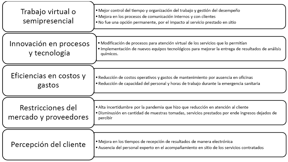 Dadas las restricciones, se presentaron impactos en la forma de operar por múltiples empresas, las cuales tuvieron que adaptarse a la nueva normalidad para continuar con su actividad económica (Comisión Económica para América Latina y el Caribe [CEPAL], 2020). Dentro de estos cambios se encuentra el teletrabajo, alternancia en el trabajo presencial, alteraciones en los canales de distribución, modificación de turnos de producción, disminución de personal (Bnamericas, 2020), entre otros aspectos, que obligaron a las empresas que querían permanecer en el mercado a generar acciones precisas con el fin de adaptarse a los cambios y contrarrestar los efectos negativos de los mismos.