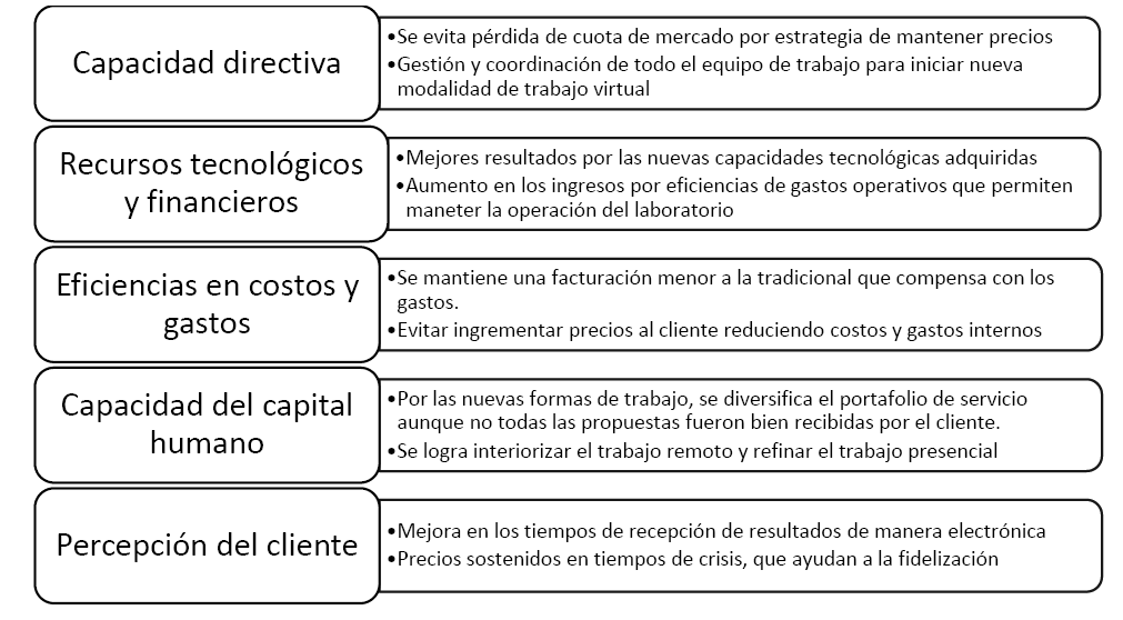 En cuanto a la influencia en la competitividad; de acuerdo con los resultados de la entrevista; el cambio organizacional más relevante en el marco de la pandemia por Covid 19 fue el recorte de personal y la rotación de empleados en trabajo presencial y virtual. Estas medidas tomadas por el laboratorio obedecieron a la necesidad de hacer un uso óptimo de los recursos económicos y financieros, además de generar procesos de seguimiento y control respecto a la gestión del talento humano; esto último fue de vital importancia, pues la coyuntura por la pandemia permitió al laboratorio seleccionar y retener a los empleados calificados y comprometidos con sus laborales. Según el líder administrativo al bajar esos costos operativos tras realizar algunos despidos en el laboratorio, la organización no tuvo la necesidad de subir precios; esta decisión le permitió a la empresa conservar el liderazgo competitivo respecto a los precios de los servicios semejantes y sustitutos en el mercado. En la Figura 2 se condensan los principales impactos que generaron los cambios organizacionales en la competitividad según las cinco subcategorías analizadas en la entrevista desarrollada, que permite ver desde el punto de vista organizacional el resultado de las decisiones tomadas en el momento de incertidumbre y que aceleró estas determinaciones operacionales.