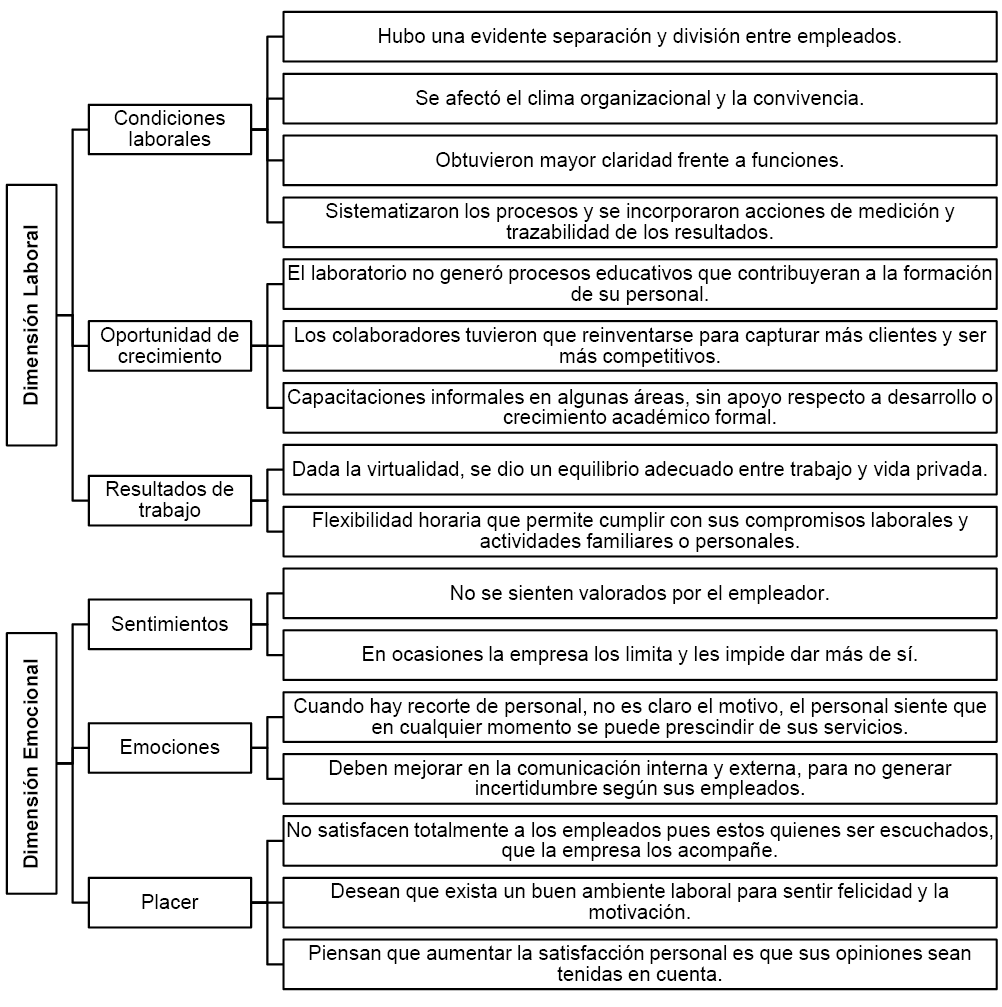 En la figura 3 se consolida la percepción de los empleados del área operativa que participaron en el grupo focal y cómo a partir de lo laboral y emocional se pueden identificar impactos organizacionales en las subcategorías abordadas en el estudio.