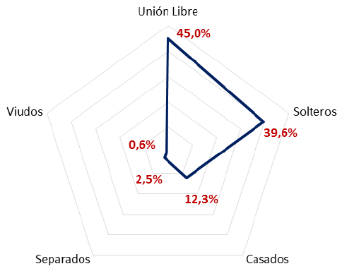 De las características sociodemográficas se encontró que respecto al estado civil, tal como se muestra en la figura 1: (a) el mayor porcentaje de los participantes de este estudio viven en unión libre (45%) y 39,6% son solteros; y (b) 12,3% son casados, 2,5% son separados y solo 0,6% son viudos.