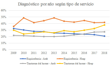 Los servicios de atención ambulatoria muestran que del 2009 al 2015 el diagnóstico de esquizofrenia es el más frecuente, aunque con una tendencia a la baja año tras año. A partir del 2017 los trastornos del humor (afectivos) pasan a ser el diagnóstico moda, de nuevo con un comportamiento en la gráfica que refleja su incremento y, al tiempo, un decrecimiento en la proporción de diagnósticos por esquizofrenia.
