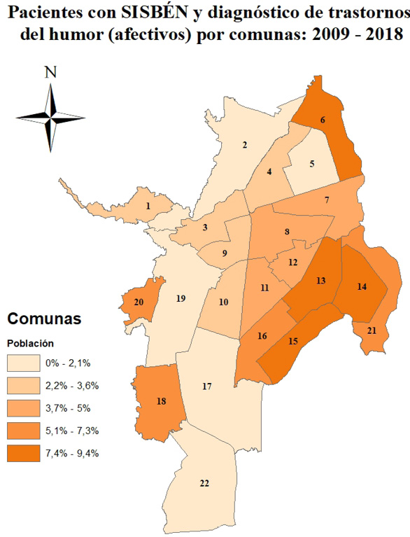 A nivel espacial, la mayoría de los pacientes se ubican en el conglomerado oriente, (comunas 6, 13, 14, 15, 16 y 21) y de ladera (comunas 1, 18 y 20), que son, dicho sea de paso, las que presentan mayores condiciones de conflicto y vulnerabilidad en la ciudad. Al respecto, en otras investigación con base en la Encuesta Nacional de Salud Mental del 2015 y la clasificación de municipios en conflicto permanente, interrumpido, finalizado o sin conflicto del Centro de Recursos para el Análisis de Conflictos (CERAC), se identificó que los territorios más violentos reportan tasas de prevalencia más altas de trastornos depresivos, ansiedad y de posible estrés postraumático (Gómez-Restrepo et al., 2016). En esta misma línea, las víctimas del conflicto colombiano en situación de desplazamiento suelen tener prevalencias altas de síntomas o trastornos mentales (Campo-Arias et al., 2014; Tamayo Martínez et al., 2016).
