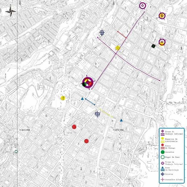 En color amarillo aparecen los lugares que fueron denotados como de convivencia, siendo estos en los que se posibilita la aparición de relaciones afectivas y de amistad, ligadas a prácticas de reconocimiento de la esfera del amor, tales como el parque Galarza, el Hogar de Paso, la Concha Acústica. Estos son altamente coincidentes con los lugares de trabajo, por lo que se puede pensar que en la calle estas dos dimensiones no están separadas. En contraste, aparecen lugares de riesgo de algún tipo de agresión, marcados con rojo, tales como el parque Galarza, y algunas calles aledañas. Finalmente, en verde están los lugares de reestablecimiento de derechos en que la institucionalidad del estado se hace visible, tales como el Hogar de Paso, el Parque Galarza y la Alcaldía Municipal.