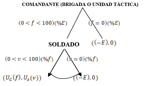 Se parte aquí del supuesto de que los altos mandos del Ejército colombiano no desconocían que este tipo de crímenes estaban ocurriendo. Es conveniente subrayar que entre 2002 y 2008 más de 150 batallones y unidades tácticas pertenecientes a 41 brigadas, subscritas a 7 divisiones existentes, habían cometido falsos positivos (Human Rights Watch, 2015). Por tanto, el juego planteado es entre los altos mandos representados por el comandante del Ejército nacional y otros comandantes subordinados, como los de brigada y unidades tácticas, y los soldados o mandos no superiores como autores materiales de los falsos positivos. Esta interacción ocurría en un contexto en el que las unidades ejercían presión por bajas, motivadas por el incentivo económico procedente de la política de seguridad democrática y por la imposición de un castigo o tomando represalias contra aquellos que no cumplieran órdenes. En este juego se asume que la probabilidad de ser encontrado culpable y judicializado es mayor para un soldado que para un alto mando del Ejército3.