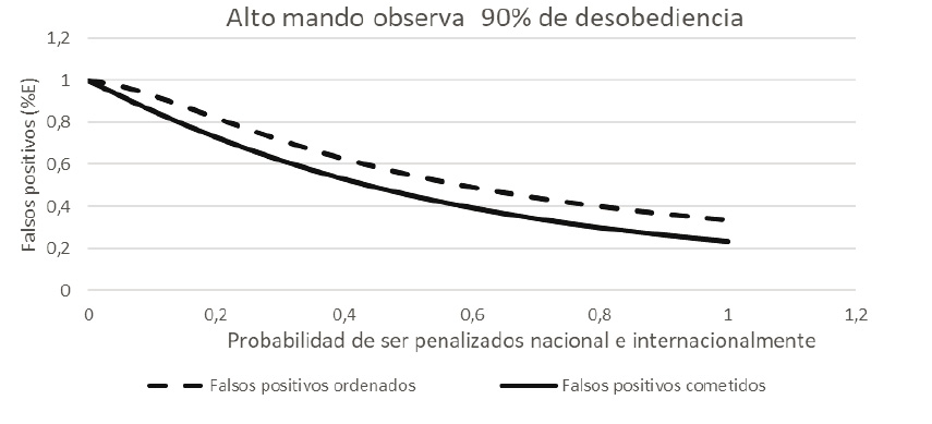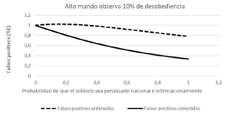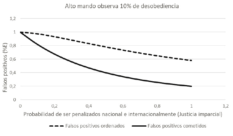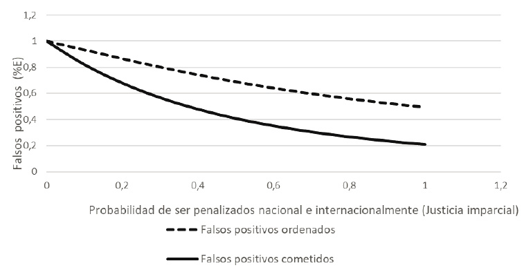 Ahora, cuando no existe ninguna clase de castigo, el alto mando ordenará exactamente el número de falsos positivos que necesita para cumplir su objetivo y el soldado cumplirá dicha orden al pie de la letra; de esta manera, el número de civiles asesinados y presentados como bajas en combate será el ideal para que el alto mando logre alcanzar el primer puesto en las estadísticas de bajas y reciba beneficios. No obstante, cuando la probabilidad de condena y de castigo internacional es inminente, tanto el alto mando como el soldado van a tratar de evadir dicho costo, razón por la cual los falsos positivos ordenados disminuirán en un 60 % respecto del ideal y los cometidos aproximadamente en un 78 %.