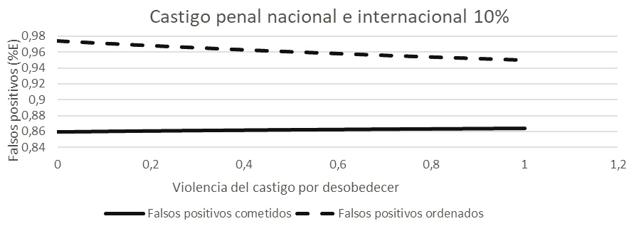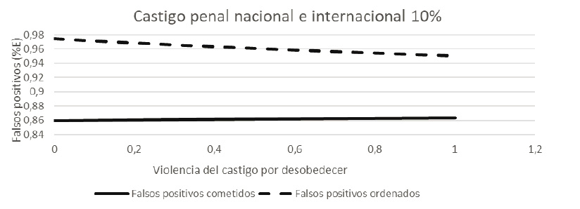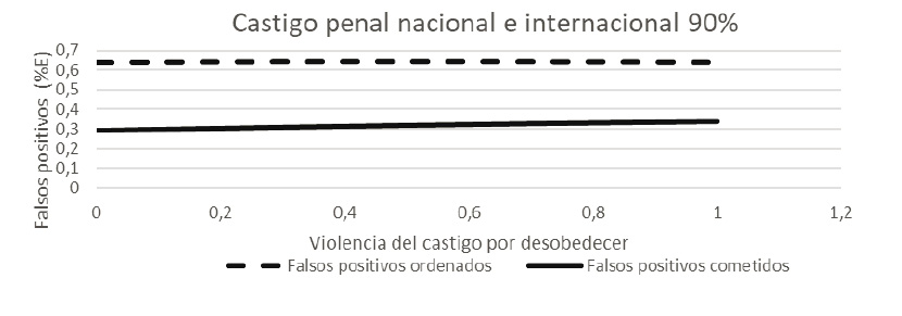 En la Figura 6 se observa que cuando el soldado enfrenta una probabilidad del 10 % de ser condenado por la justicia colombiana y por la comunidad internacional, pero el alto mando sabe que dicha probabilidad para él es nula, este ordenará cometer incluso más falsos positivos de los que necesita para alcanzar su objetivo, y el soldado cometerá aproximadamente un 90 % del ideal de bajas. Además, se cometerán aproximadamente un 14 % más ejecuciones extrajudiciales que cuando la justicia castiga por igual al principal y al agente.