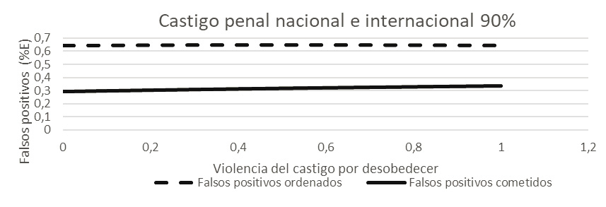 Figura 5. Efectos del aumento de la probabilidad de condena y castigo internacional cuando la justicia colombiana es imparcial en falsos positivos ordenados y cometidos, dado el monitoreo del alto mando.