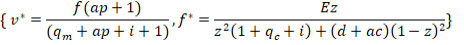 Donde, f* es el número óptimo de ejecuciones extrajudiciales que ordena el alto mando al soldado, v* es el número óptimo de falsos positivos que son llevados a cabo después de dicha orden y . E>0 es el porcentaje ideal de falsos positivos; a ϵ [0,1] es la proporción esperada de desobediencia que el alto mando está en la capacidad de observar, i ϵ [0,1] es la probabilidad de un castigo internacional por cometer esta clase de crímenes, qm ϵ [0,1] y qc ϵ [0,1] son la probabilidad de ser judicializados por las autoridades colombianas del soldado y el alto mando respectivamente. Además, c>0 es lo que le cuesta al alto mando castigar la desobediencia, d ϵ [0,1] es la preocupación del alto mando por proteger su legitimidad y p>0 es la violencia esperada por parte del soldado acerca del castigo impuesto por el principal.
