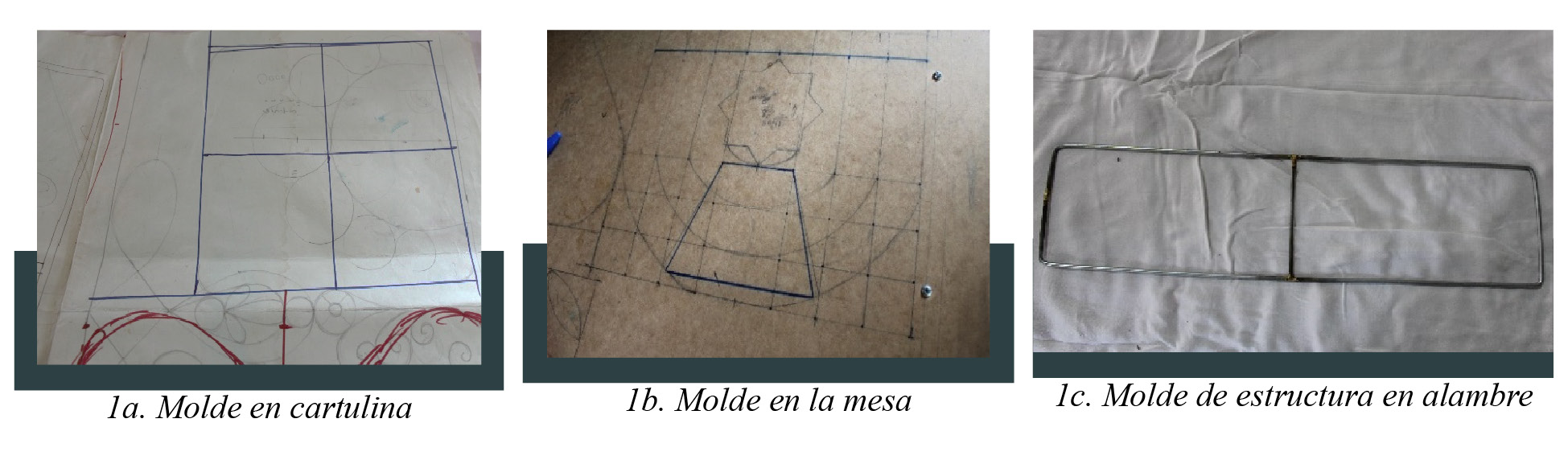 Para la creación de moldes, los artesanos usan diferentes métodos, de hecho, hay artesanos que desarrollan su propio método. Para realizar los moldes en cartulina, los artesanos usan reglas, cinta métrica, lápiz y compás. A partir de cálculos matemáticos, ellos van desarrollando el molde y van dibujando sobre la cartulina. Como se mencionó anteriormente, los artesanos desarrollan moldes directamente sobre la mesa implementando igualmente reglas, cinta métrica, lápiz, marcadores y compás. Para el molde de estructura de alambre, los artesanos utilizan comúnmente los alambres de calibre 10 y 12, ya que estos grosores tienen una mayor firmeza y para su manipulación se necesitan herramientas como pinzas, alicates y cinta métrica.