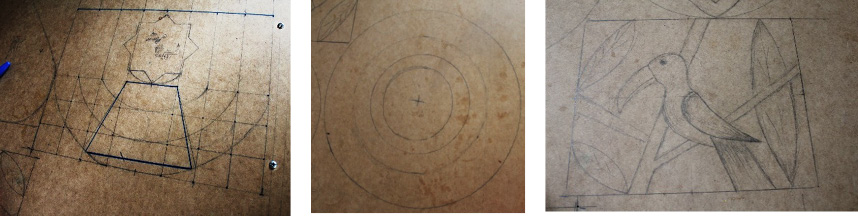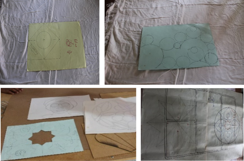 Moldes en la mesa. Como lo muestra la Figura 1b, en este caso los artesanos utilizan la superficie horizontal de la mesa para realizar el diseño del molde, sirviendo como guía para la elaboración de las artesanías. En la superficie de la mesa se dibujan diferentes tipos de diseños de figuras, siendo este un molde de figuras con medidas fijas y establecidas. Los artesanos utilizan este tipo de molde cuando el cliente solicita una artesanía que ellos ya han realizado anteriormente. Para crear estos moldes en la mesa se necesita mucha precisión y gran destreza para el dibujo, razón por la cual, por lo general, los artesanos contratan a un dibujante para realizarlos. En este molde se diseñan figuras poligonales, en algunos casos concéntricas, trapecios, semicírculos, estrellas (Figura 2, que es una extensión de la Figura 1b).