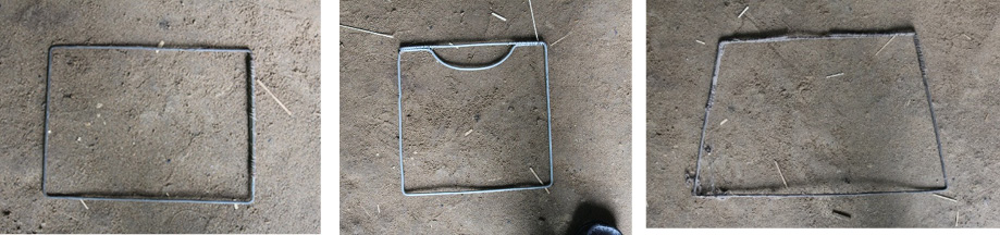 Para la elaboración de las estructuras en alambre de una lámpara, el artesano debe elaborar 3 estructuras donde 2 son iguales: una para la estructura inferior y la otra para la estructura superior; la otra figura es para el centro y es 2 cm más grande. En la lámpara pequeña los patrones ilustrados en la cartulina son los siguientes: para las estructuras de la base y la parte de arriba la medida es 4 cm de lado, para la estructura del centro es 8 cm de lado, es decir, tiene 2 cm más que la de la base y la parte de arriba. En la Figura 6 se muestra cómo el artesano, con la ayuda de los patrones, elaboró en alambre la estructura para el centro y las estructuras inferior y superior.