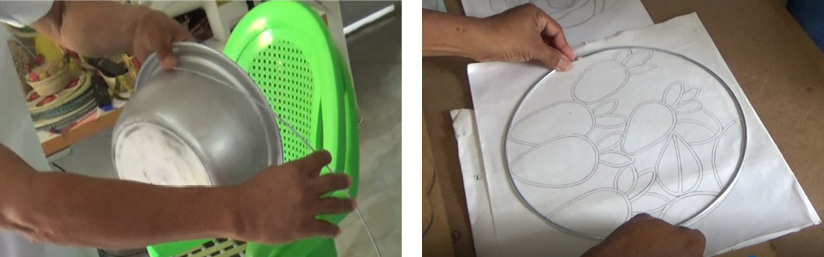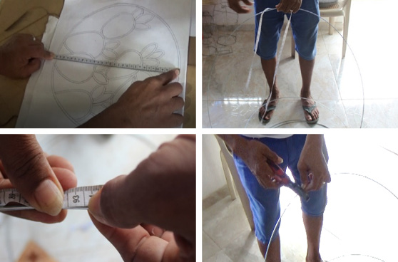 Para la elaboración de las estructuras circulares, que el artesano llama bolitas, utiliza una técnica llamada por él la “teoría del pi”, que consiste en la utilización de un patrón circular que ya tenía dibujado con una medida establecida. Mide el diámetro del molde circular con cinta métrica, seguido a esto el diámetro obtenido lo multiplica por 3 y le añade 3,5 cm, para luego marcar el resultado total con la ayuda de la cinta métrica; por último, corta el alambre donde marca la medida y así realiza la estructura. (Figura 4).