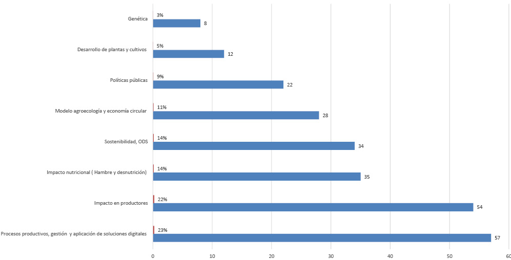 Del análisis realizado se encuentra que los procesos productivos, la gestión, la aplicación de soluciones digitales y el impacto a los productores acumula el 45 % de las publicaciones de los tres años, en tanto que los dos siguientes elementos son el impacto en la nutrición y la pobreza, y las dificultades para alcanzar la sostenibilidad y los objetivos de desarrollo sostenible. El 11 % de los artículos analizados proponen modelos de agroecología y economía circular, un 9 % llama la atención sobre la importancia de la gobernanza en el sector y el desarrollo de políticas públicas, conducentes a solucionar los problemas provocados y bajar el impacto de los estructurales, y el 8 % se centra en el desarrollo de las plantas, su genética y los cultivos.
