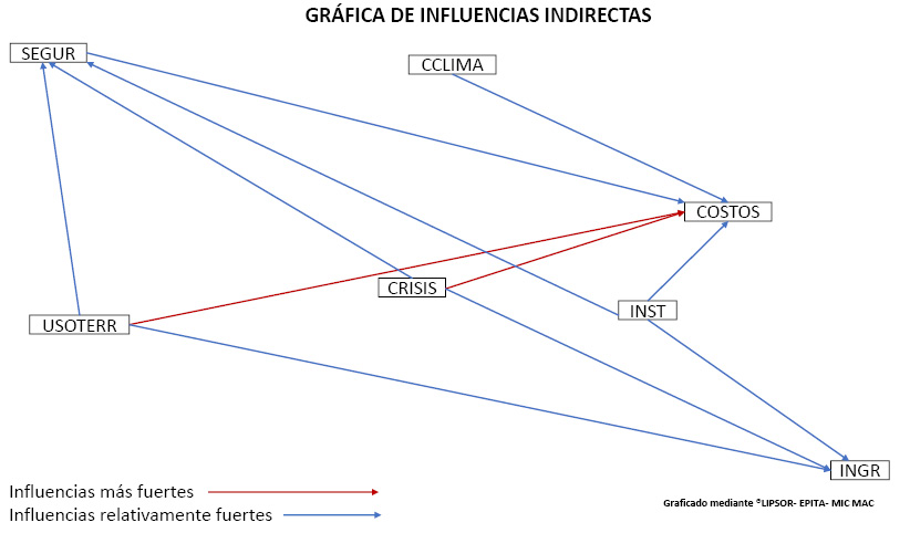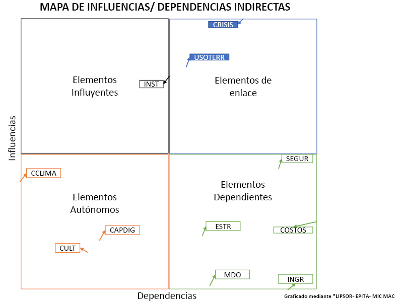 Análisis estructural mediante el empleo de multiplicación de matrices de impacto cruzado, aplicada con fines de clasificación (MIC MAC). En esta etapa de análisis estructural se realizó un ejercicio de valoración de influencias y dependencias entre los elementos para reconocer aspectos del funcionamiento del sistema y clasificar estos elementos de acuerdo con su poder de incidir sobre los demás.