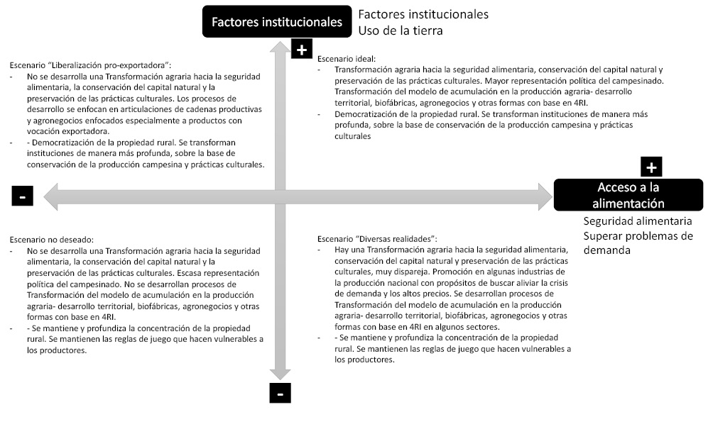 Escenario no deseado: (condiciones desfavorables en ambas categorías). No se desarrolla una transformación agraria hacia la seguridad alimentaria, la conservación del capital natural y la preservación de las prácticas culturales. Escasa representación política del campesinado. No se desarrollan procesos de transformación del modelo de acumulación en la producción agraria- desarrollo territorial, biofábricas, agronegocios y otras formas con base en 4RI.