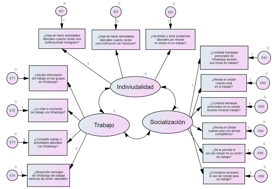 Al observar el análisis factorial confirmatorio es evidente que los empleados administrativos que labora en las oficinas del Gobierno Municipal de Manizales, Colombia dejan de realizar sus actividades laborales cuando reciben una notificación de Instagram o Facebook, lo cual les genera algún tipo de conflicto laboral, además usan el WhatsApp como una herramienta de comunicación y medio para compartir información del trabajo, pero también el teléfono inteligente y sus aplicaciones son una forma de interactuar con el mundo interior y exterior.