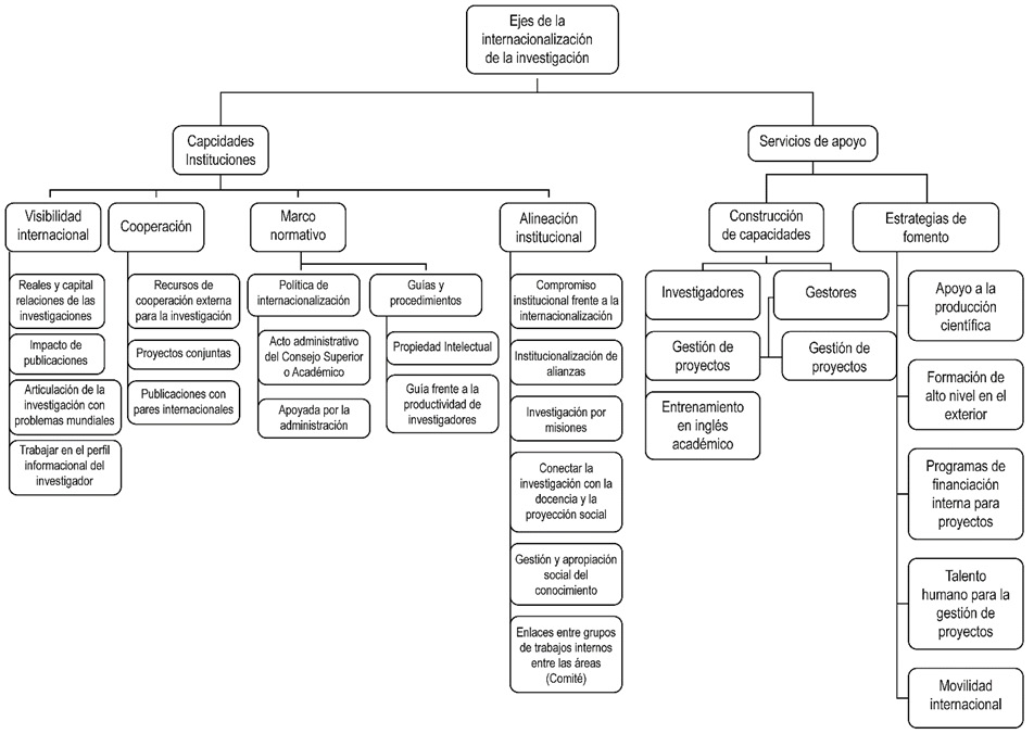 Al revisar los mecanismos que sugieren los entrevistados para el desarrollo de la internacionalización de la investigación se han generado tres categorías: “visibilidad internacional”, “capacidades institucionales” y “servicios de apoyo”. En la categoría de “visibilidad internacional” se expone que se deben caracterizar los grupos de investigación de la IES, así como generar un portafolio de servicios para la internacionalización de la investigación. Igualmente se deben identificar fuentes de recursos y contar con las redes de aliados correspondientes que permitan generar alianzas para la investigación internacional.