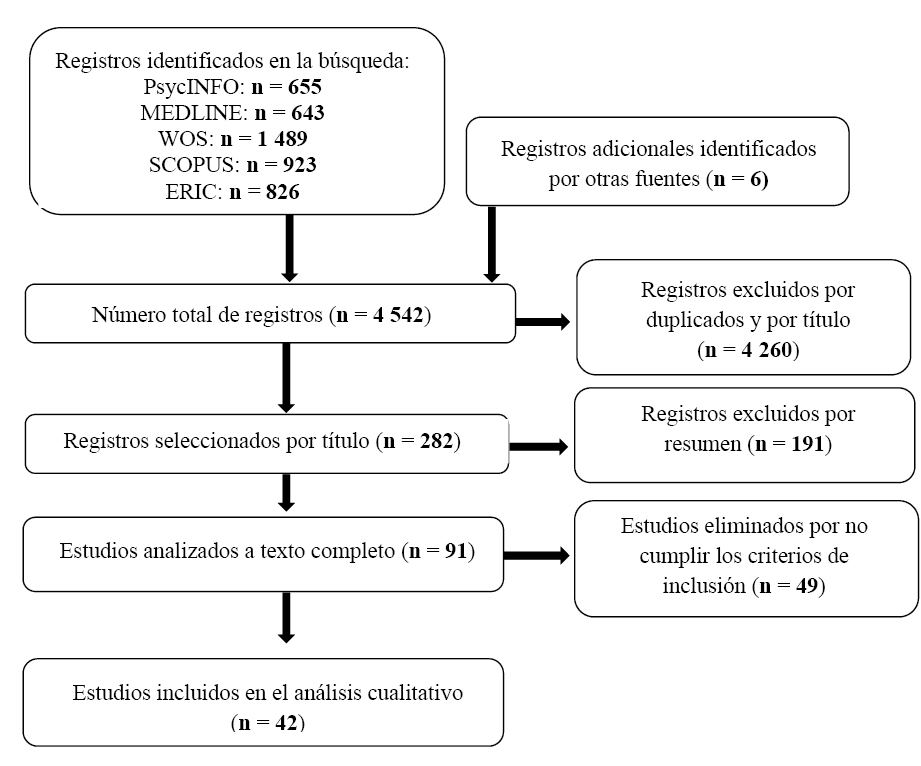 Se incluyeron 42 artículos (ver Tabla 2). El proceso de selección puede verse en la Figura 1. La búsqueda en bases de datos arrojó 4 536 registros, a los que se sumaron 6 estudios identificados manualmente. Después de eliminar 4 260 por duplicidad y/o título y 191 por resumen irrelevante, se seleccionaron para su revisión a texto completo 91 artículos, descartando finalmente 49 por no reunir los criterios de inclusión.