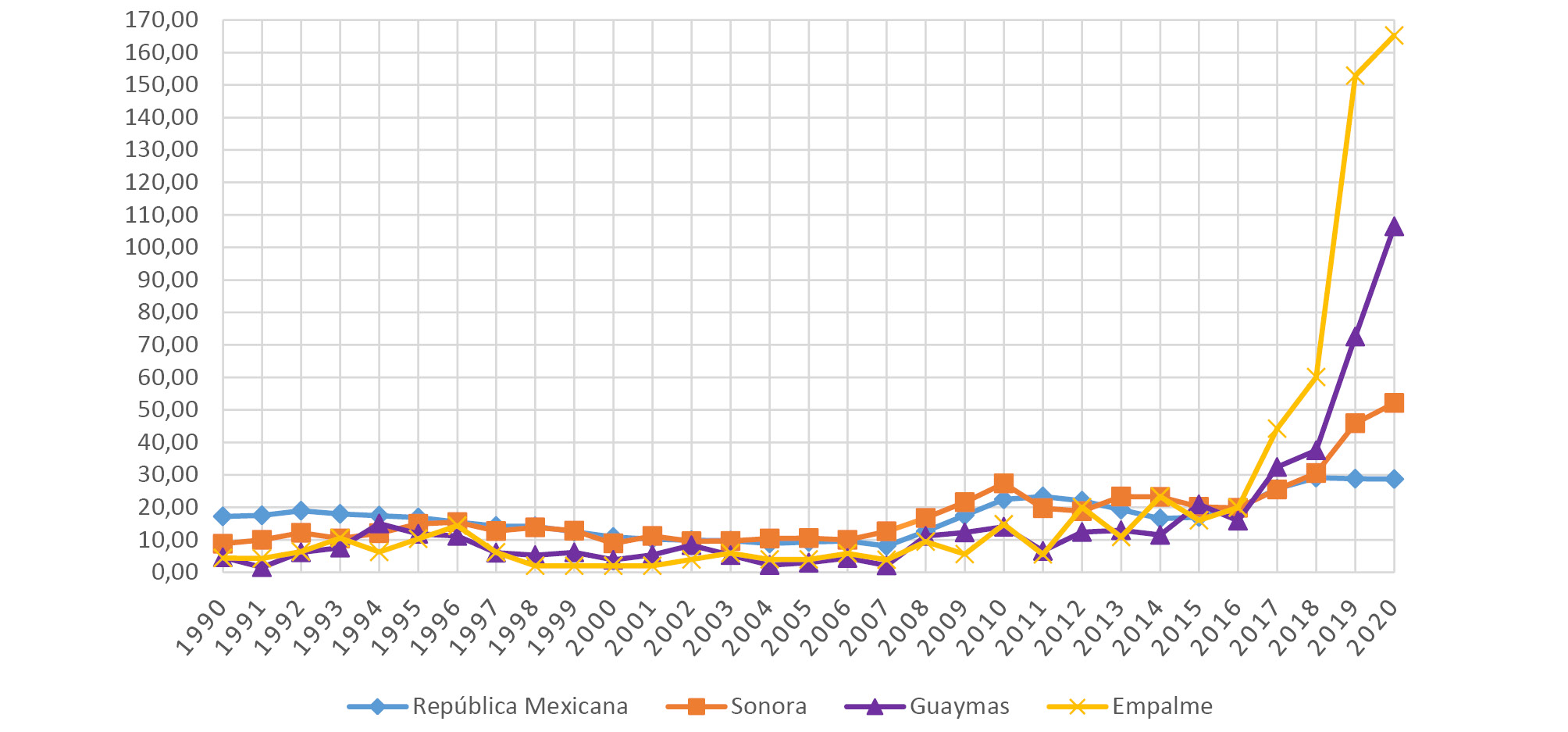 Desde inicio de los 90, el comportamiento de los homicidios venía a la baja de forma generalizada. Es a partir de 2007, con la llamada Guerra contra el Narcotráfico en México, que se observan cambios importantes en la comisión de los asesinatos, sobre todo a nivel nacional y estatal. De este modo, es en los últimos años cuando la violencia letal alcanza niveles extraordinarios. De forma local, la cifra de homicidios en Guaymas entre 2016 y 2020 suma 416, lo que representa el 58 % de los 717 asesinatos registrados entre 1990 y 2020, mientras que para Empalme los 232 homicidios cometidos entre 2016 y 2020 corresponden al 68,63 % de las incidencias de las últimas tres décadas observadas (338 en el periodo 1990-2020), contrastando notablemente con lo sucedido a nivel nacional y estatal.