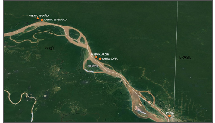 Esta investigación se desarrolló a través de un enfoque cualitativo y se llevó a cabo en la ribera del Río Amazonas, entre los municipios de Leticia y Puerto Nariño, como se presenta en la figura 1. En estas entidades territoriales se contactaron, principalmente, a las instituciones municipales y departamentales encargadas del tema de salud pública. Adicionalmente, se contó con la participación de tres comunidades indígenas: Nuevo Jardín y Santa Sofía, las cuales están ubicadas a 29 y 30 km de Leticia, respectivamente, y se encuentran bajo la jurisdicción administrativa de este municipio. La comunidad de Puerto Esperanza, se localiza a 63 km de Leticia y hace parte de la jurisdicción administrativa de Puerto Nariño.