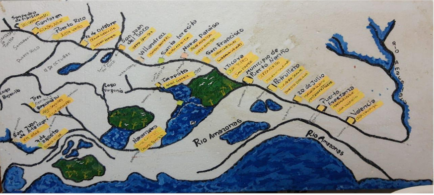 A través de conversaciones con las autoridades político-administrativas indígenas (Cabildos), se obtuvieron los permisos para trabajar en las comunidades de Santa Sofía, Nuevo Jardín y Puerto Esperanza entre noviembre de 2021 y diciembre de 2022. Estas comunidades se autodefinen como parte del pueblo Tikuna (Magüta), el cual habita, comúnmente, en los territorios ubicados a lo largo de la ribera de pequeños ríos que desembocan en el Amazonas, entre los países de Colombia, Brasil y Perú (Rengifo et al., 2017). Se considera que, estas poblaciones, cuentan con una economía híbrida, ya que desarrollan actividades de subsistencia tradicional como la pesca, la caza y la siembra y, además, realizan actividades productivas relacionadas, principalmente, con el turismo (Garzón-Garzón, 2017).