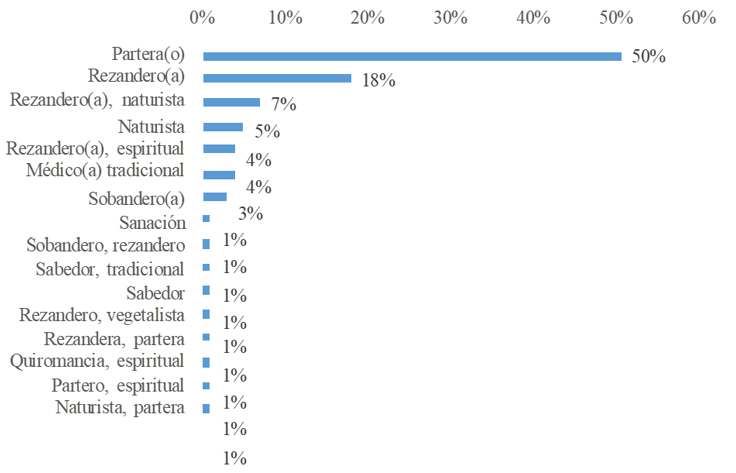 Asimismo, es complejo el entendimiento de estas nominaciones por quienes ejercen la medicina tradicional, la utilizan e interactúan con ella desde las instituciones. De los sabedores entrevistados, el 42 % se autodenominó como médicos tradicionales, el 33 %, yerbateros y, el 16 %, parteras. Es importante destacar que, un sabedor, no consideró relevante ponerle una denominación a su práctica medicinal y lo explicó de la siguiente manera: