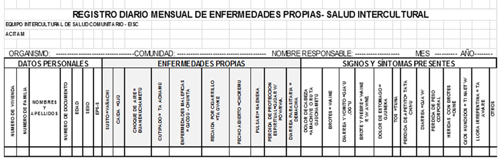 En el caso de ACITAM, el proceso de caracterización de sus comunidades se llevó a cabo con la realización de dos asambleas, en un lapso de 12 meses. Si bien falta por ampliar la información sociocultural, este trabajo ha permitido la consolidación de un directorio de sabedores con sus respectivas especialidades, un listado de conceptos propios de la medicina tradicional y uno de las plantas medicinales más usadas en los tratamientos. Asimismo, se elaboró de manera colectiva, con la participación de los auxiliares de salud y sabedores, un formato de reporte de atención a la salud, presentado en la figura 4, que será empleado como una base de vigilancia comunitaria.