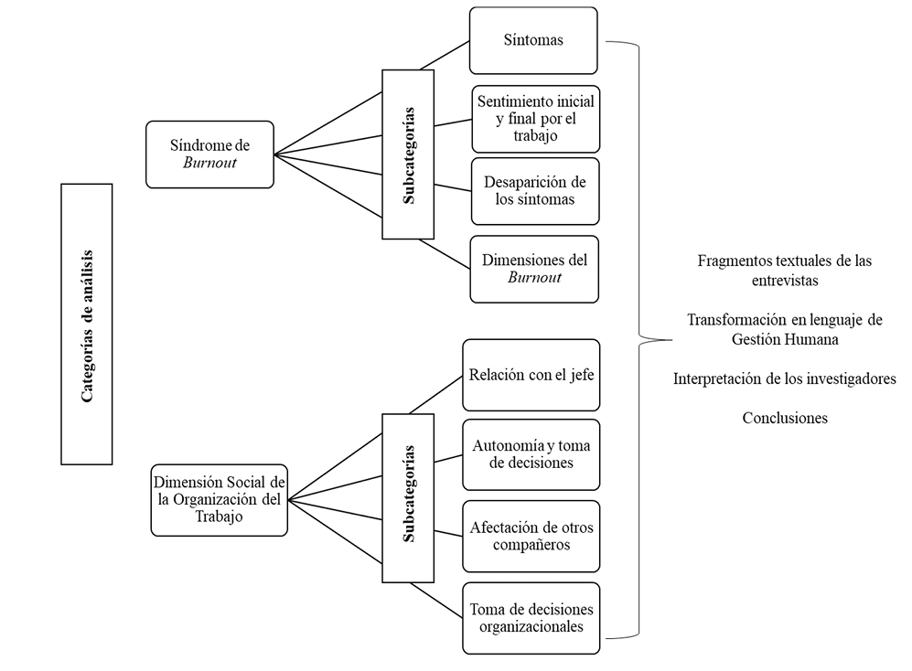 Para el análisis de las entrevistas, se utilizó el instrumento propuesto por De Castro et al. (2007), el cual se adaptó de la siguiente manera: (a) categoría de análisis; (b) categorías emergentes (o subcategorías); (c) fragmentos textuales de las entrevistas; d) transformación en lenguaje de gestión de personal; (e) interpretación de los investigadores; (f) conclusiones. Este instrumento permitió clarificar las manifestaciones de los participantes con los hallazgos teóricos de ambas categorías; también, facilitó disminuir los prejuicios de los investigadores, guiar las interpretaciones y determinar las conclusiones.