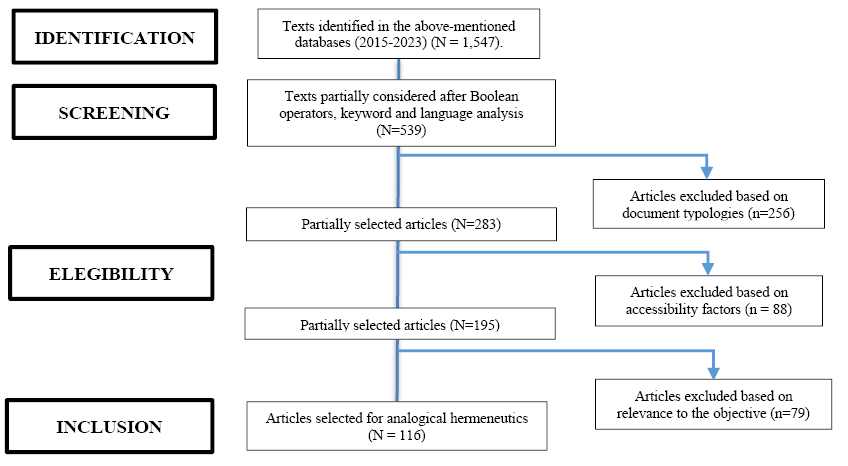 The methodology for interpreting the texts was analogical hermeneutics (Beuchot, 2016) because of its relevance for understanding texts and social phenomena that move between interpretative extremes, detractors and defenders, as in the case of ai and its impact on teachers and students. Analogical hermeneutics focuses on analogy (balanced or phronetic vision) when two extreme positions are confronted: “univocity” and “equivocity”, and it is structured in syntactic, semantic, and pragmatic phases (Beuchot, 2016).