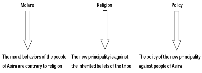 Amqasem also revealed the “Asira” people’s ritual celebrations, in which a clear mixture between men and women, dancing, singing and celebrating without any religious or moral controls. The author says, “The Mother ordered a number of girls to go up the hill of the village, behind the ceremony, and to give their hair to the wind, swaying, and showing their beauty for the distant viewer, and little by little people ,old and young , came from their valley to the villages of Sabya valley (Wadi Sabya), to watch this ceremony, which is full of girls up Wadi Al-Husseini hills” (Amqasem, 2009, p120). Yahya Amqasem also focused on celebrations and weddings, and sharing of people and other tribes to these ceremonies and rituals. He said, “At the time of dinner dance, the girls came to participate with men, and there is no fire shooting in this dance regarding to the tenderness of the virgins existed in the field appreciating to their tender souls. The girls had stood in front of men, and each one of them chose a man who likes to join, making a glorious row with their wonderful clothes” (Amqasem, 2009, p120). And there were aromatic plants coming from the heads of girls and men, mixing with the breath of pride and vanity, and all have at the same moment, a smile that cannot be shown in any happy circumstance, as if it is the smile of eternity of this beauty that the girls ’fingers share with the fingers of men which are intertwined as a victorious one body with one soul” (Amqasem, 2009, p120). The new principality is trying to confront the people of “Asira” and considers that these behaviors are contrary to the ethics of society and religion, trying to change these rituals and customs inherited throughout the ages by changing the image of concepts and habits of life that must be changed to bear a positive significance consistent with the new intellectual and moral principles of the principality. We notice, from the foregoing, a semantic pluralism for the untold semiotic from the prohibited moral. According to the principality’s opinion, there are bad behaviors in the balance of morals that would affect religion.
