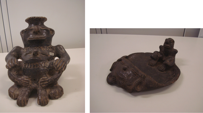 Figura 3 y 4. 1. Pieza constituida de dos figuras antropomorfas masculinas, sedentes, base plana. 2. Bandeja con representaciones antropomorfas. Circular, base plana, tiene una figura antropomorfa en alto relieve en el plato y un rostro antropomorfo opuesto.