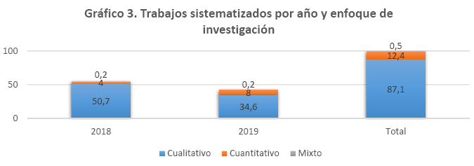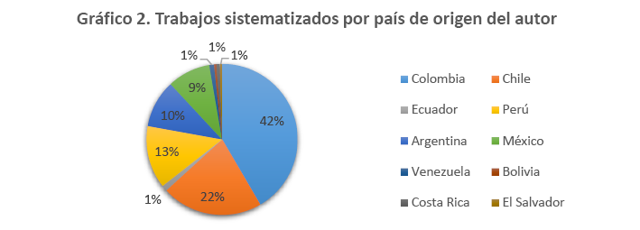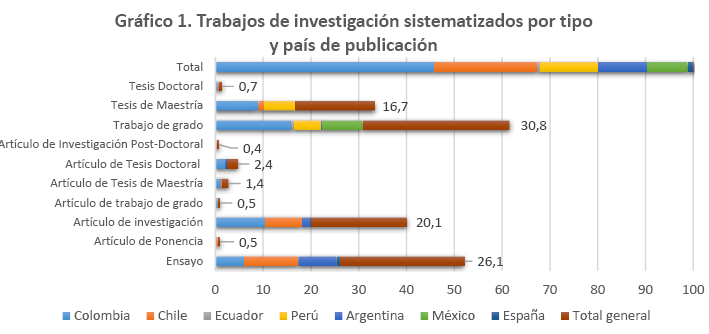 La ponderación de los métodos y técnicas encontrados en los trabajos consultados se hizo bajo ciertos criterios de clasificación. En cuanto al tipo de estudios sistematizados, la mayoría (30,8 %) fueron trabajos de grado, seguido de artículos de reflexión (26,1 %), artículos de investigación (20,1 %) y tesis de maestría (16,7 %). Los países con mayor número de publicaciones fueron Colombia (45,7 %), Chile (21,6 %), Perú (12,2 %), Argentina (10,2 %) y México (8,4 %). El mismo orden se mantiene al considerar la nacionalidad de los autores. Asimismo, el año de estudio con mayor número de trabajos presentados fue 2018 (55 %), disminuyendo las publicaciones para 2019 (42,8 %).