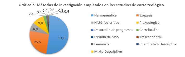 En cuanto a los estudios realizados con métodos meramente teológicos, donde predominó la hermenéutica, Burgos (2010), ya con anterioridad resaltó el papel de esta como matriz epistemológica para una praxis teológica más sistémica e interdisciplinaria. De igual modo, Ayala (2013) encontró una opción preferencial de los investigadores por el método hermenéutico teológico, y Saldaña (2019) señala que la hermenéutica se asume como una racionalidad o lógica comprensiva más que como una metodología tipo recetario que desvirtúa la esencia del proceso hermenéutico. Este aspecto continúa haciéndose presente en la investigación teológica latinoamericana de los últimos años.