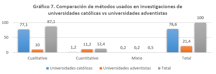 En 42,3 % de los estudios se empleó como técnica principal la reflexión hermenéutica. En las investigaciones cuantitativas, resalta la encuesta o cuestionario (12,9 %). Para los estudios exegéticos, prevalece el análisis semántico (10 %). Otra técnica que resalta es la que deriva del método praxeológico latinoamericano o teología de la acción (6 %). Por último, en el Gráfico 7 se ve el uso que se da a los enfoques metodológicos en universidades católicas y universidades adventistas (Universidad Peruana Unión y Universidad Montemorelos de México). Dentro de este último grupo, se sumaron cuatro artículos, tres de la Corporación Universitaria Adventista de Colombia y uno de la Universidad Adventista de Bolivia, que fueron divulgados por universidades católicas.