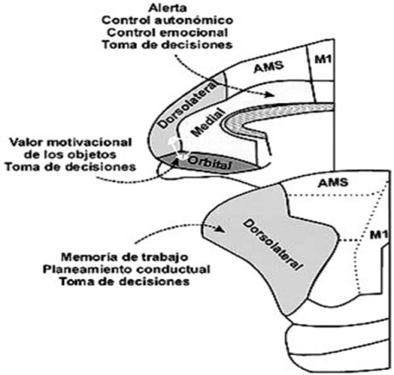 Retomando las tres zonas descritas anteriormente, la información sensorial, tanto externa como interna, coincide en el lóbulo frontal y marca una orientación en la actividad neural de la corteza prefrontal; esto, en consecuencia, aumenta la probabilidad de que un comportamiento se ejecute en detrimento de otro u otros. En un sentido mucho más específico, Valdés y Torrealba (2006) definen el lóbulo prefrontal como la región más humana del cerebro, destacando la importancia y especificidad del proceso evolutivo que ha actuado sobre ella, que ha alcanzado su máxima extensión y nivel de complejidad en los primates; sin embargo, el desarrollo en los humanos ha sido incalculable. La sección de la corteza tiene una participación capital en el control de la conducta, la personalidad, los comportamientos motivados (que son indispensables en la supervivencia del individuo y de la especie), la memoria de trabajo (concepto clave en relación con las funciones ejecutivas), la toma de decisiones, la conformación de expectativas de recompensas, las funciones cognitivas superiores, las funciones intelectuales superiores o funciones cerebrales superiores y el control ejecutivo (Bechara, Damasio & Damasio, 2000; Schultz, 2000). Las anteriores acotaciones, en relación con lóbulo prefrontal, están dirigidas a una coordinación de respuestas motoras complejas junto a respuestas autonómicas y endocrinas. Estas respuestas (motoras, automáticas y endocrinas) tienen que ser activadas por el incremento de la alerta conductual con el fin de que el aprendizaje y las conductas se den; en el caso de que existan niveles muy altos de alerta conductual o, por el contrario, niveles muy bajos, la conducta puede no presentarse.