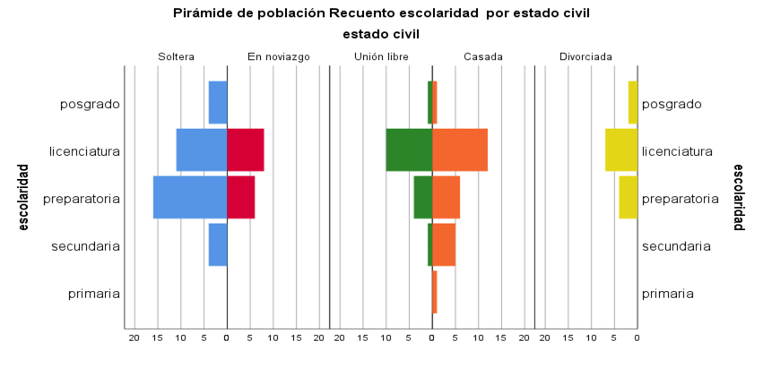 Para este estudio se encuestaron a ciento tres (100 %) mujeres de la Ciudad de México entre dieciocho y cincuenta años, donde hubo catorce (13,59 %) participantes con edades de dieciocho a veinticuatro años, diecinueve (18.44 %) participantes con edades entre veinticinco a treinta y un años, cuarenta y un (39,80 %) participantes con edades entre treinta y dos a treinta y ocho años, veintiún (20,38 %) participantes con edades entre treinta y nueve a cuarenta y cinco, y ocho (7,76 %) participantes con edades entre cuarenta y seis a cincuenta años. En cuanto al grado de escolaridad de las participantes, la muestra se conformó por una mujer con primaria (,97 %), diez mujeres con secundaria (9,71 %) y treinta y seis mujeres con preparatoria (34,95 %) que conformaron el grupo 1; el grupo 2 se conformó por cuarenta y ocho mujeres con licenciatura (46,60 %) y ocho mujeres con posgrado (7,77 %). Las participantes contaron con diferente estado civil, treinta y cinco mujeres solteras (33,98 %), catorce mujeres en noviazgo (13,59 %), dieciséis mujeres en unión libre (15,52 %), veinticinco mujeres casadas (24,27 %) y trece mujeres divorciadas (12,62 %) (figura 1).